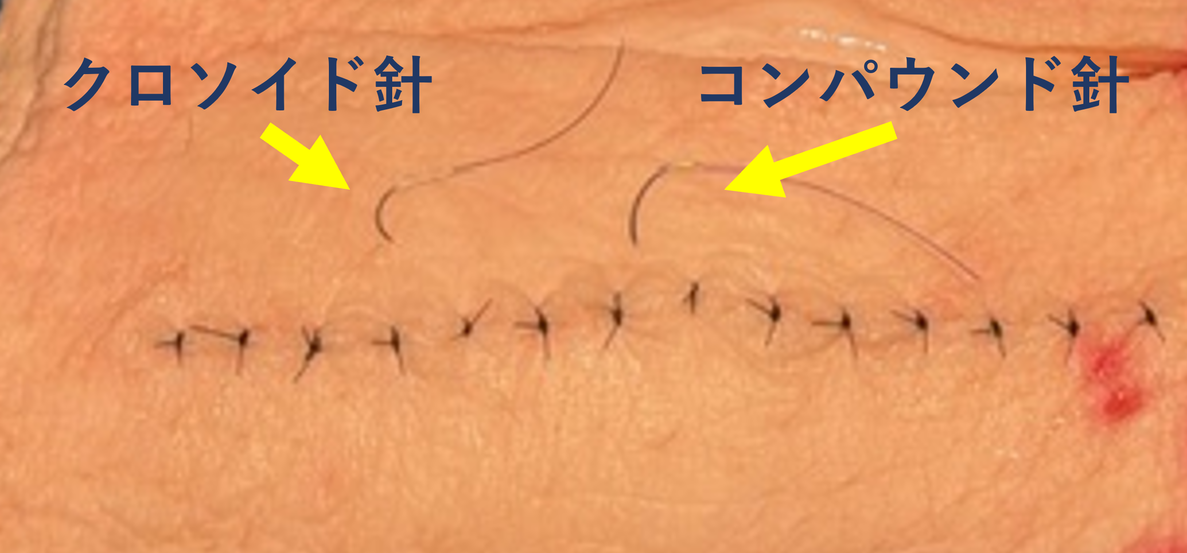 豚の皮でデモンストレーションしています。ヒトではないですよ。■従来の縫合針の課題とは? 一般的に使用されてきた「強湾針(カーブの強い針)」は、扱いやすい反面、いくつかの課題があります。 真皮を点で捉えるような刺入になりやすい 組織を十分に拾えないことがある 創部に局所的な張力が集中しやすい 結果として、瘢痕が広がる・目立つ原因になる 形成外科では、「いかに張力を分散させるか」が非常に重要です。 この課題を解決するために設計されたのが、コンパウンド針です。 ■コンパウンド針とは?|真皮縫合の精度を高める設計 コンパウンド針は、針の先端と根元で湾曲の強さが異なる特殊な構造を持っています。 この設計により、従来針では難しかった以下の操作が可能になります。 ●真皮を「面」で捉える 従来は点での把持になりやすかった真皮組織を、より広い面として確実に拾うことができます。 ●一定の深さで安定した刺入 針先の設計により、真皮層へ適切な深さで均一に刺入しやすくなります。 ●組織を平行に扱いやすい 組織のズレを抑えながら、自然な位置関係で縫合が可能です。 ■臨床的メリット これらの特性により、 創部の張力が分散される 創縁の段差が出にくい 瘢痕の拡大や肥厚を抑制 といった効果が期待できます。 つまり、コンパウンド針は**「より美しい傷跡を目指すための針」**と言えます。 ■クロソイド針とは?|操作性を飛躍的に高める表皮縫合針 クロソイド針は、数学的な曲線(クロソイド曲線)を応用した、連続的に曲率が変化する針です。 一見するとわずかな違いですが、実際の操作性には大きな影響を与えます。 ■従来針との大きな違い 通常の湾曲針では、 刺入時 抜去時 ともに手首の回内・回外を伴う動きが必要です。 しかしクロソイド針では、 ●抜針動作が非常にスムーズ 針の軌道が自然に変化するため、回転操作を最小限に抑えて抜去可能 ●手首の負担軽減 術者の動きがシンプルになり、長時間手術でも疲労を軽減 ●狭い術野でも有効 スペースが限られる部位でも、無理な操作をせずに扱えます ■逆クロソイド針のメリット さらに応用として、「逆クロソイド針」も有用です。 刺入は直針のようにシンプル 抜去時はクロソイドの特性でスムーズ つまり、 **「入れやすく、抜きやすい」**という両立が可能になります。 これは、 顔面などの繊細な部位 狭い創部 角度制限のある縫合 において非常に有効です。 ■縫合針の選択が瘢痕を左右する 形成外科において、縫合は単なる「閉じる作業」ではありません。 組織をどのように扱うか 張力をどう分散させるか 微細なズレをどこまで抑えるか これらすべてが、最終的な瘢痕の質に直結します。 ■まとめ|より美しい仕上がりのために 今回ご紹介した2種類の針は、それぞれ明確な役割を持っています。 コンパウンド針 → 真皮をしっかり捉え、張力を分散し、瘢痕を美しくする クロソイド針 → 操作性を高め、正確でスムーズな表皮縫合を可能にする これらを適切に使い分けることで、 より精密で、より美しい創部の仕上がりが実現できます。 当院では、こうした細部にまでこだわり、 エビデンスと技術の両面から、最適な治療を提供しています。写真は豚の肉です。