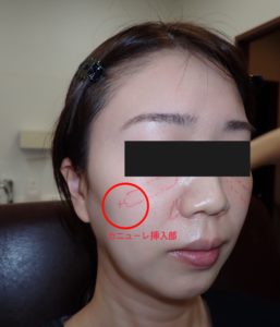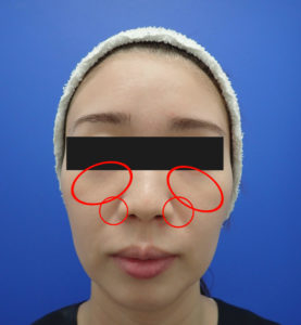 赤丸のところが気になるところです。今回はゴルゴラインと少し鼻翼基部にも入れて頂きました。